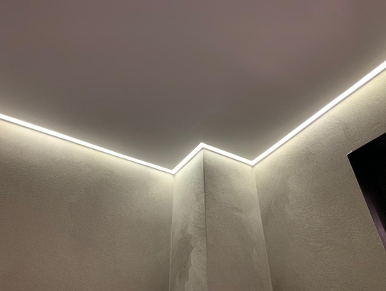 Во вторых такой конструкции как правило отдаётся предпочтение во влажных помещениях. Не взирая на то, что светодиодная лента не сильно реагирует на влажную среду, в контурном потолке она просто не имеет контакта даже теоретически. Но ещё раз обращаю Ваше внимание, что в нашей практике достаточно объектов с контурным потолком выполнялось в спальной зоне, особенно если потолок с фотопечатью, и по задумке дизайнера должен закрывать полную площадь, так же в гостинных, особенно когда орнамент имеет общую концепцию с фото на натяжной стене.