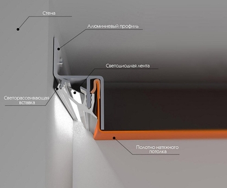 Много схожего с парящим, вдоль стены выделенная полоска света. Механизм монтажа соответствует парящему. Но с выключенной подсветкой не парит в воздухе, а полностью доходит до стены, как обычный потолок. За счёт чего это достигается. Профиль с пазом для ленты затянут полотном. В этом случае ленту нельзя обслужить без демонтажа, впрочем этого почти никогда не требуется. Свет проходит через плёнку. Учтём, что плёнка очень хорошо пропускает световые потоки. Для чего используют подобную конструкцию? Во первых кому то больше нравится без паза, вплотную со стеной.