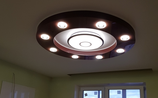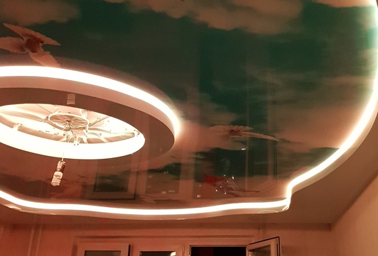 Немного похоже на фокус: днем потолок выглядит как обычно — белый матовый либо глянцевый. Но ночью, при зажженном свете, он оживает: светящиеся полосы бороздят полотно, могут перебегать на стены, причудливо разрезая пространство и переворачивая ощущения.Как достигается такая экстравагантность: к старому черновому потолку крепятся светодиодные модули, в них светодиодная лента, завершающим этапом в профиль устанавливается на полотно - натяжной потолок. Днем не видно или не сильно заметны элементы освещения (в зависимости от выбранного варианта), но ночью свет выдаёт ровные полосы, образуя ансамбль полноценной картины.