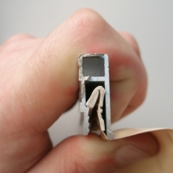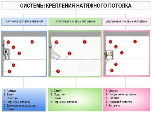 Для гарпунного крепления используется только плёночный материал. В компьютерной графике по форме потолка создается макет с усадкой, и по этим размерам в цеху на столе производится раскрой. После чего методом ТВЧ по периметру приваривается специальный крепёжный кант в форме гарпуна. Именно посредством этого канта, заправленного в профиль, обеспечивает надёжное крепление готового натяжного потолка. Настолько надёжное, что при заливе с невероятным количеством воды потолок не вырывается и удерживает жидкость, что обеспечивает защиту от залива. По периметру остаётся монтажный шов, который закрывается маскировочным кантиком. В настоящее время наиболее часто используется плёнка с технически необходимым нагревом во время монтажа. Но есть линейка плёнок, с установкой без нагрева.